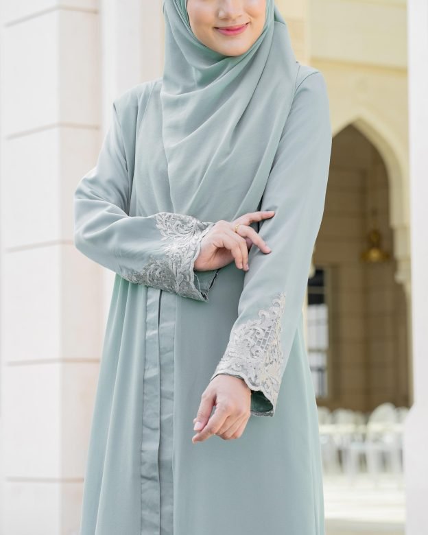 The Abaya Cardi Lace Rizka in Pistachio features a muted green tone with lace detailing, suitable for various occasions. Its design emphasizes both elegance and comfort.