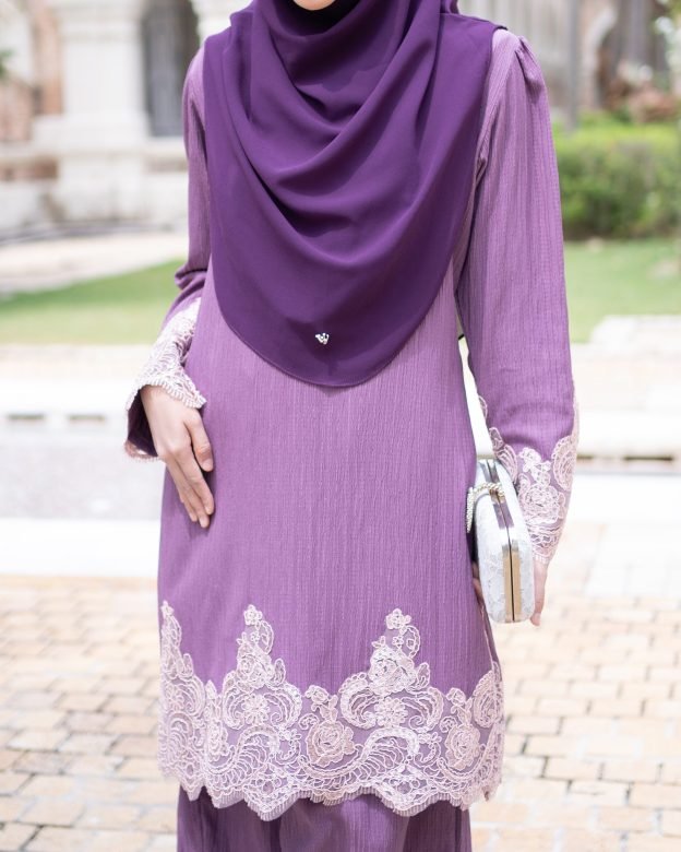 Step into a world of quiet sophistication with the Baju Kurung Moden Lace Hayley in French Violet. With lace details that lend texture and depth, and a flowy modest cut that complements all body types, this ensemble is as chic as it is comfortable. Ideal for semi-formal events and elegant brunches.