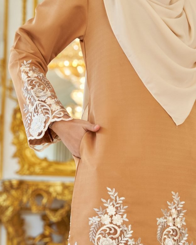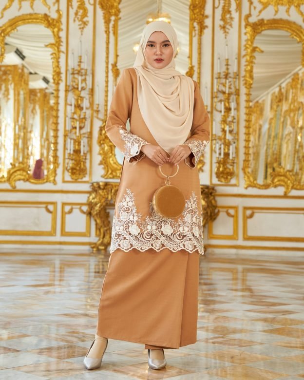 A regal combination of warmth and luxury, the Baju Kurung Royal Lace Ayra in Gold Brown is ideal for festive occasions. With intricate lace detailing and a rich, earthy tone, it provides a grounded yet glamorous look for weddings and formal events.