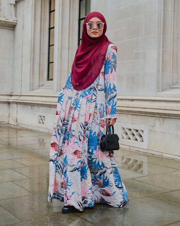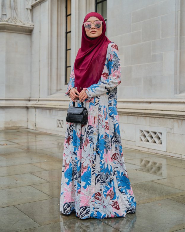 Electric blue floral print and pleated texture make this a standout piece. Great for daytime events or festive gatherings.