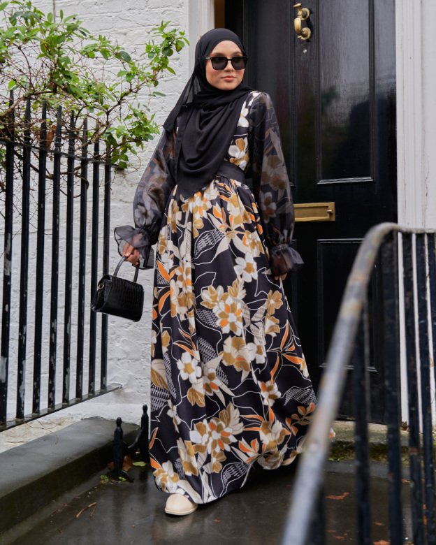 A bold floral print on a black base exudes sophistication. Designed for comfort and style, suitable for evenings or modest formal events.