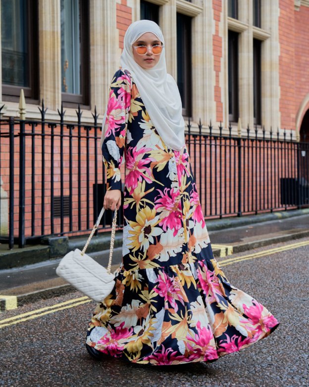 Striking floral patterns on black with ruffled accents. A dramatic yet elegant piece for dinner dates or parties.