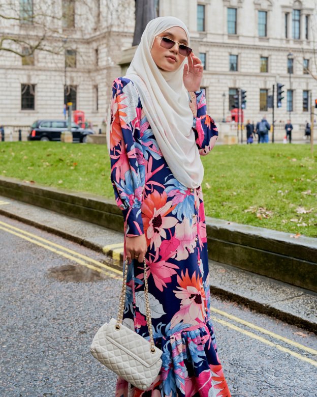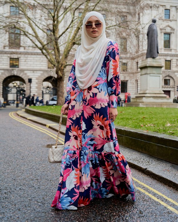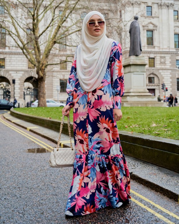 Soft blue tones and floral prints create a calming aesthetic. Ideal for work, gatherings, or modest daytime wear.